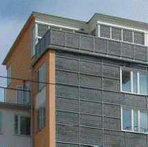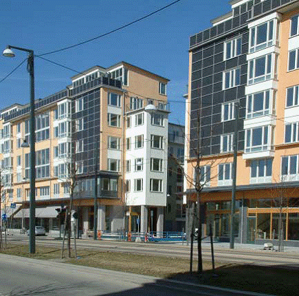 This PV-NORD demonstration project, which consists of two housing blocks, Holmen and Grynnan, is located in a new urban area, Hammarby Sjöstad, at the edge of the city of Stockholm , on the site of a former industrial area. The urban area constitutes a further development of the dense European City , but with a more green, open and flexible structure. The city revised this planning concept in the middle of the design process, which caused some disturbance and change of the design. The two similar buildings are situated side by side along a new, major avenue, Hammarby Allé. They are in seven storeys with shops on the ground floor, and dwellings on five upper floors and in a penthouse on top. Planning requirements for building in this area call for a higher level of energy efficiency and environmental quality than ordinary. The two blocks, Holmen and Grynnan, thus have PV installations towards Southwest on the facade, on the parapets of the penthouse balcony and in the windows here.
